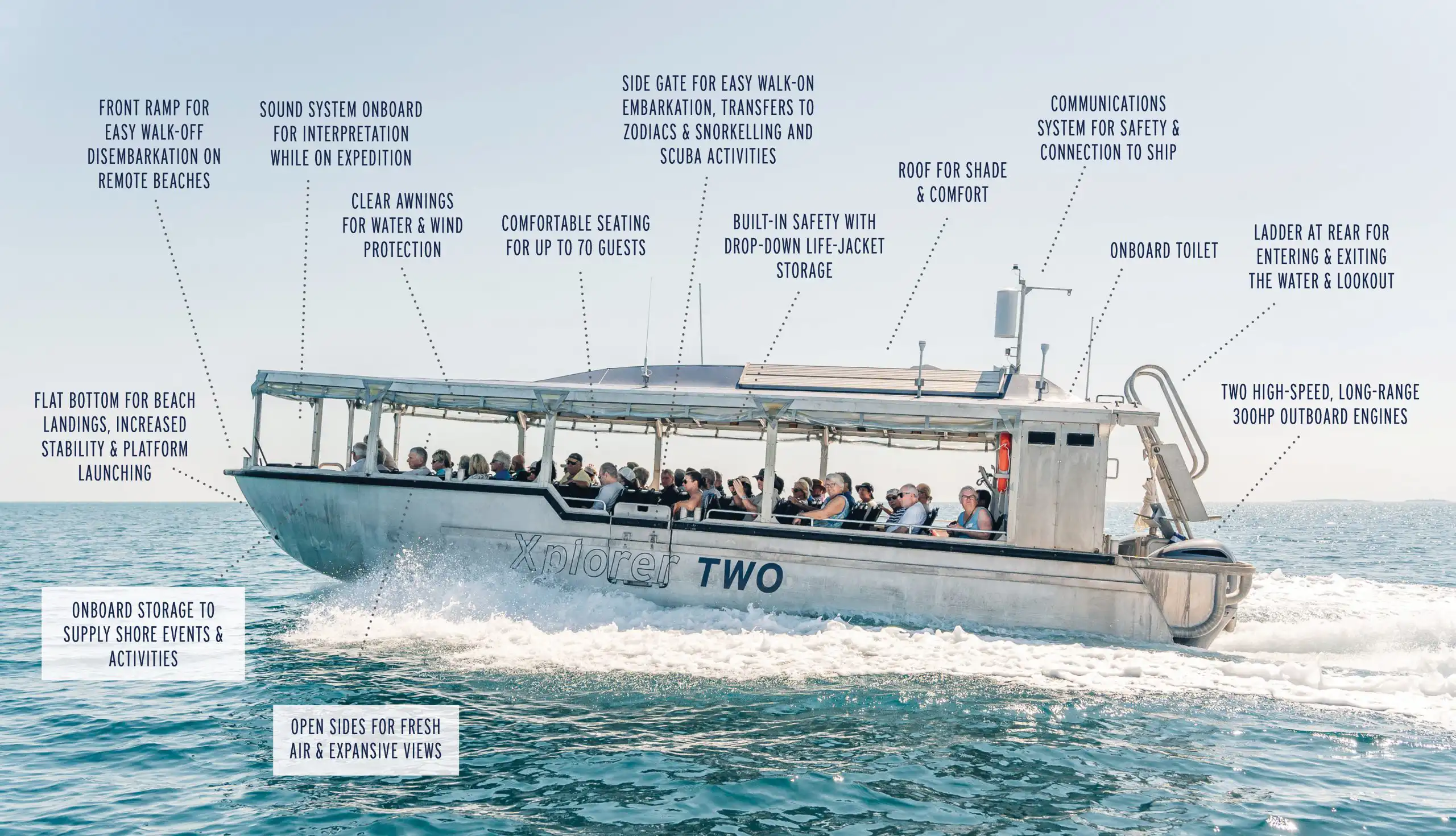 All the Coral Expedition ships come equipped with a fleet of these excursion tender vessels, thus making it easy to travel to shore and disembark. The excursion tender ‘Xplorer’ vessels ensure that all guests can travel to shore or explore hidden bays and inlets safely and comfortably.