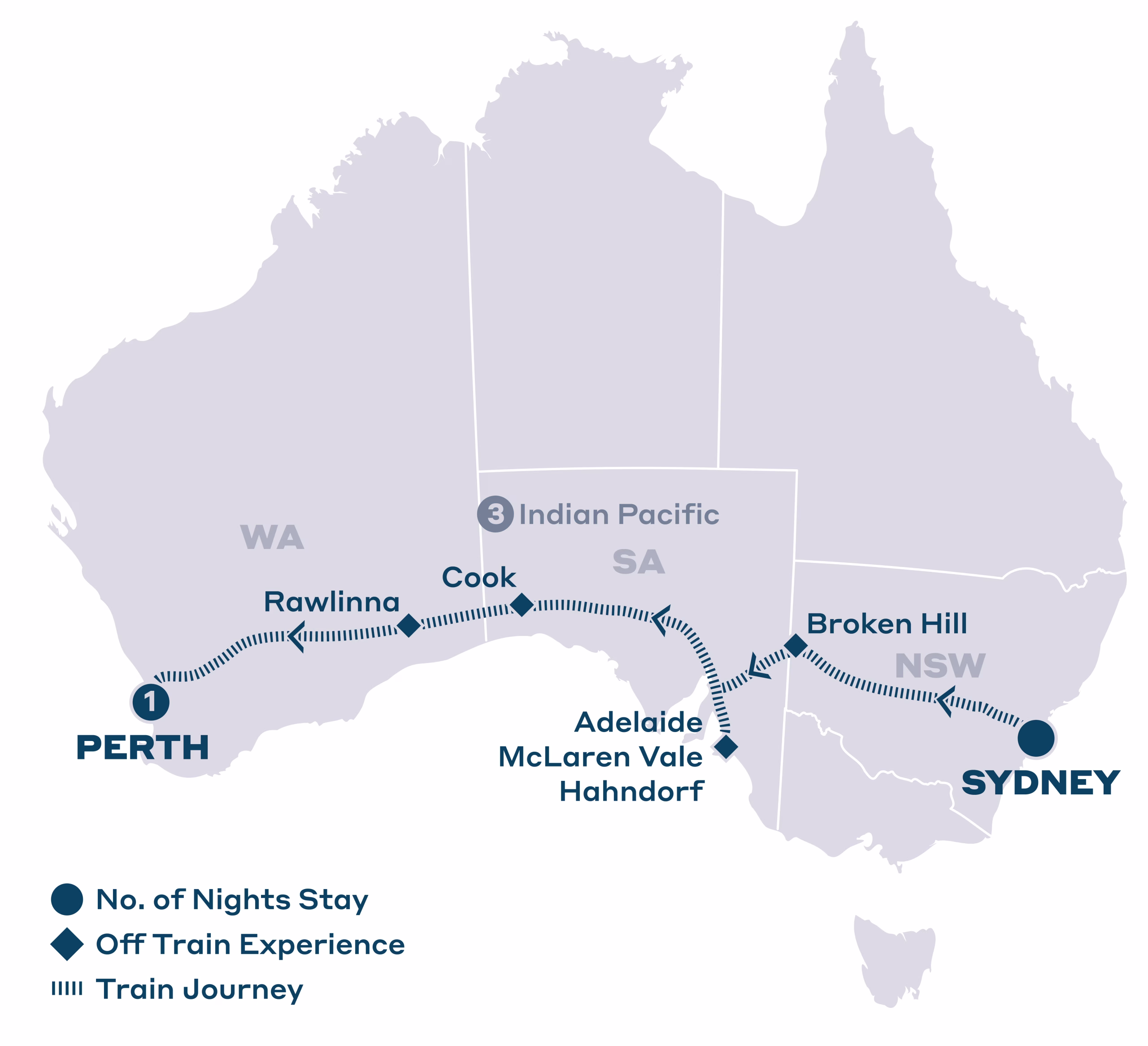 - 3 nights aboard the Indian Pacific, Sydney to Perth, including all meals, beverages and Off Train Experiences in Broken Hill, Adelaide, Cook and Rawlinna